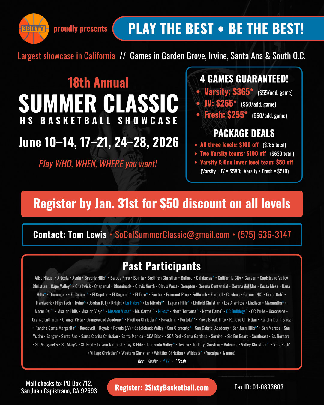 Tom Lewis annually turns out one of the best summer basketball events with his South Orange County Summer Classic. It brings together outstanding high school programs and terrific players, offering family, fans, media and scouts the chance to get an early line on the best teams and players for the following high school season, with competitive games played in first-class facilities and with the best officials anywhere in high school. It's a 'can't-miss' opportunity for high school programs and basketball fans alike.